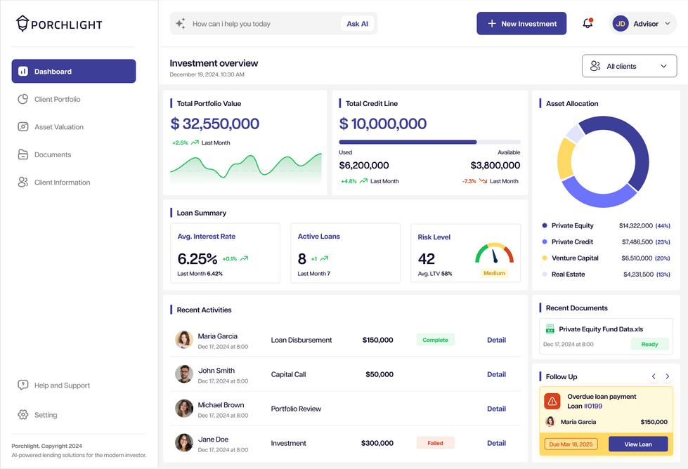 A clean, data-rich dashboard for financial advisors to monitor total portfolio value, manage credit lines, and track asset allocation. The design provides at-a-glance insights into loan summaries, risk levels, and recent client activities, with clear alerts for items needing follow-up.